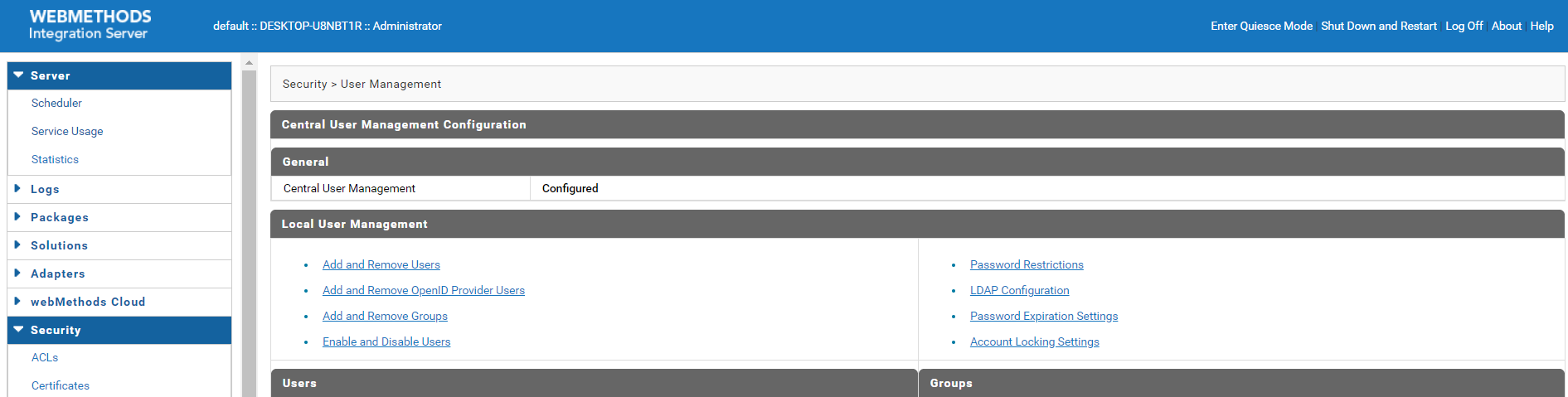 또한 Integration Server > Security > User Management 내 Central User Management Configured 가 출력되는 것을 확인 할 수 있습니다.