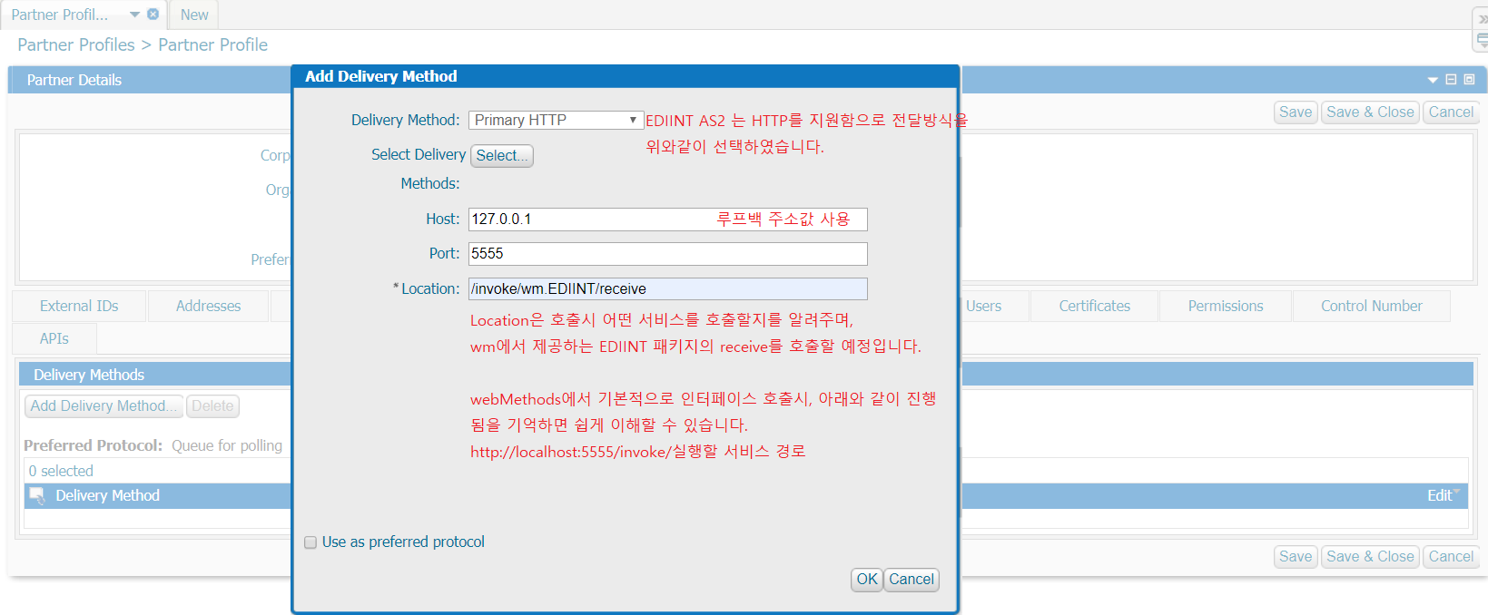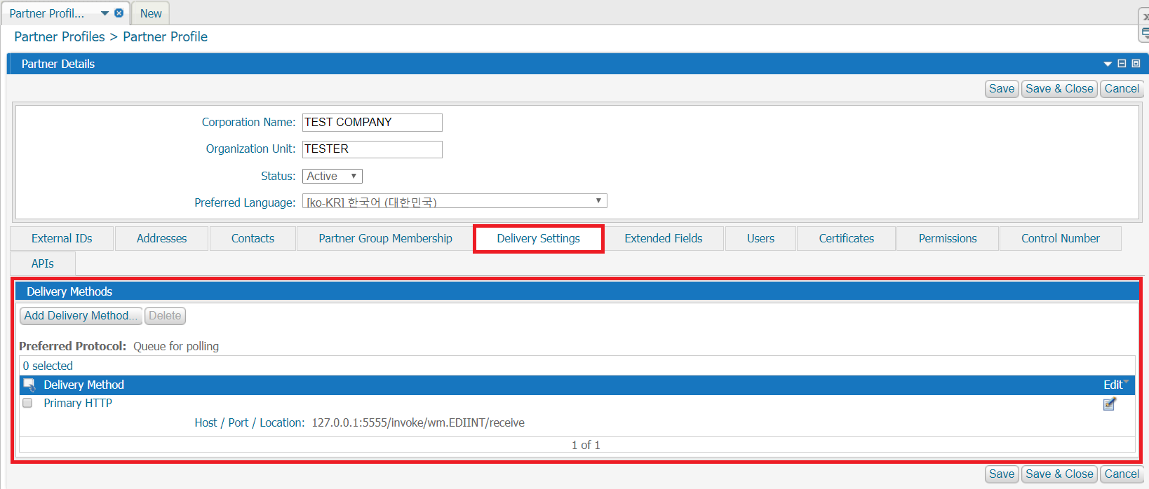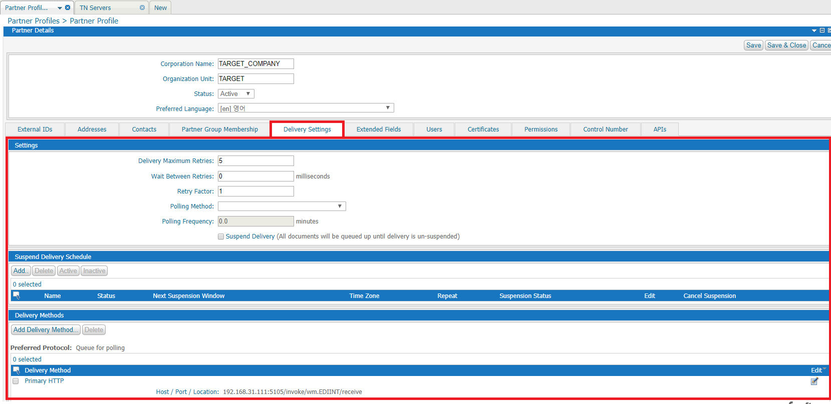 Delivery Settings 탭에서는 어떤 방식으로 파트너사와 통신을 할 건지 선택 및 EndPoint(목적지)를 설정할 수 있습니다.