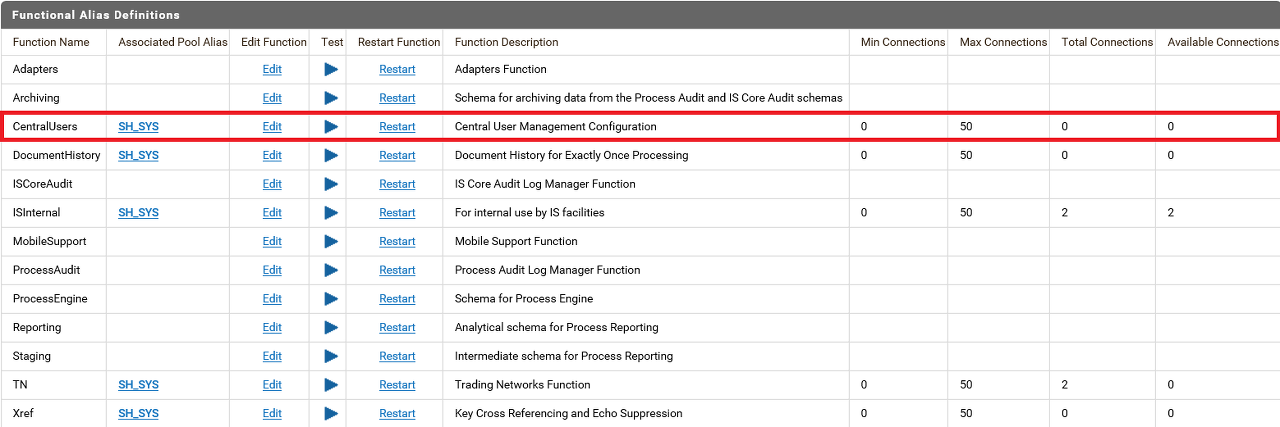 MyWebMethods(MWS) 를 정상적으로 설치하였다면 IntegrationServer( IS ) > Setting > JDBC Pools 내에 CentralUsers 가 추가 됩니다.