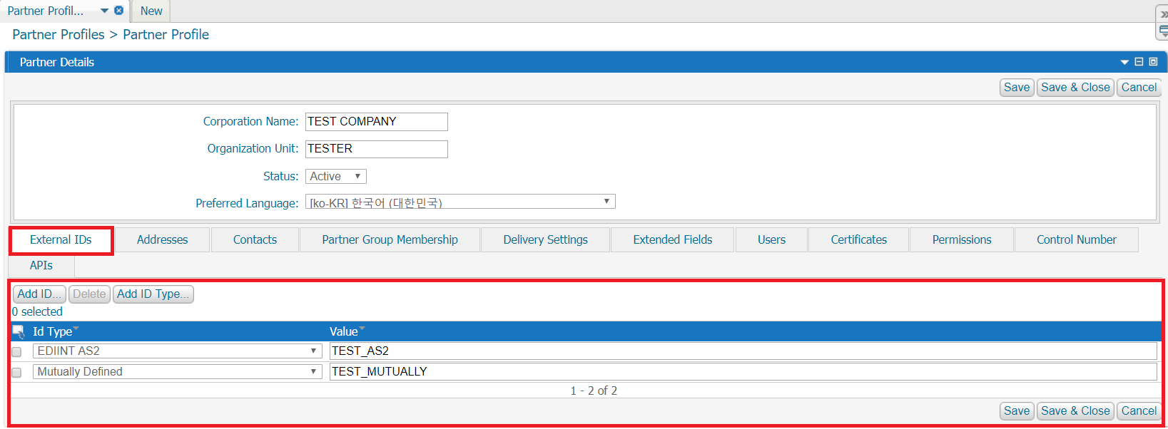 최상단은 귀사의 기본 정보이며 , External IDs 탭에서는 외부에서 접속할 수 있는 명칭을 추가하는 곳 입니다.