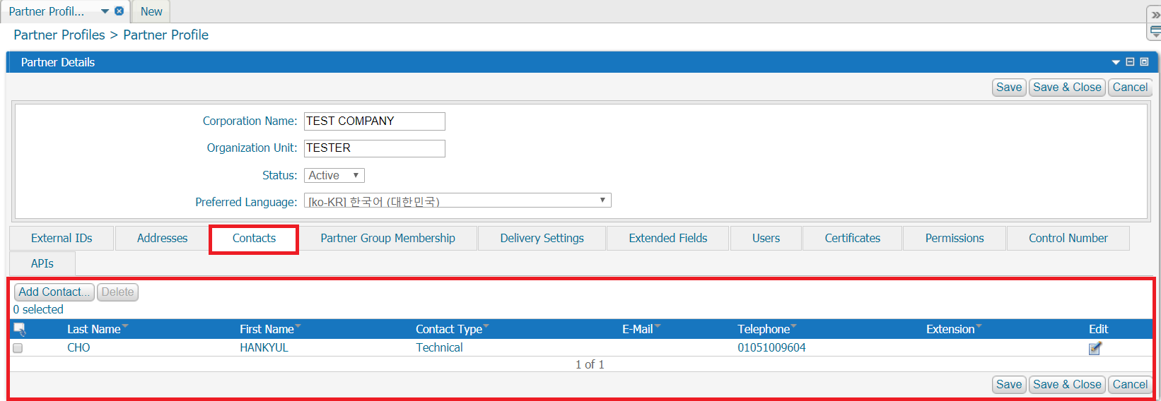 Contacts 탭에서는 담당자의 연락처를 관리 할 수 있습니다. Add Contact 을 통하여 정보를 등록합니다.