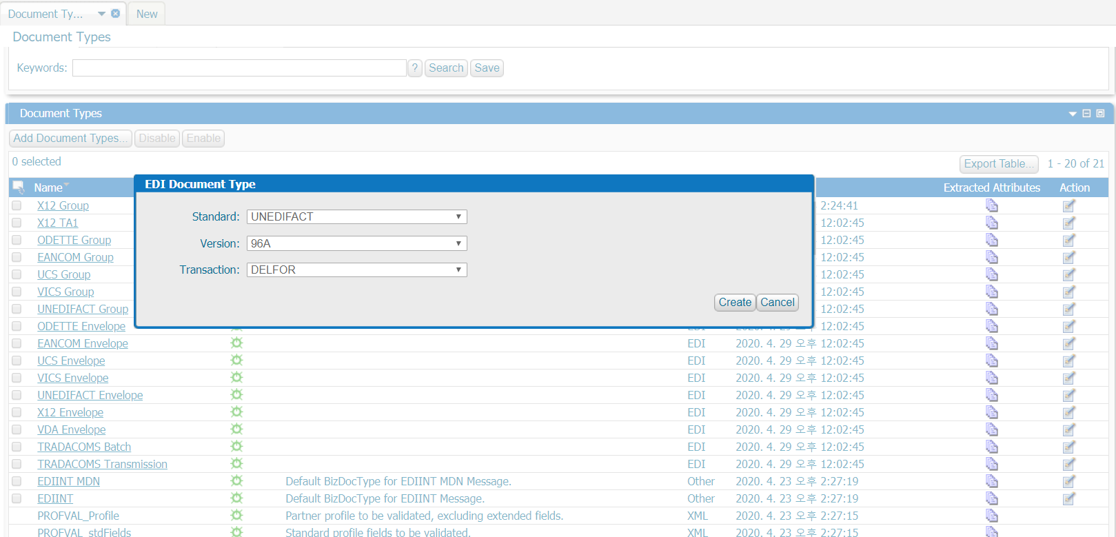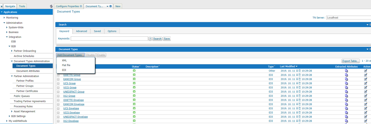 Navigate 탭에서 Applications > Administration > Integration > B2B > Document Types Administration > Document Types을 클릭합니다.