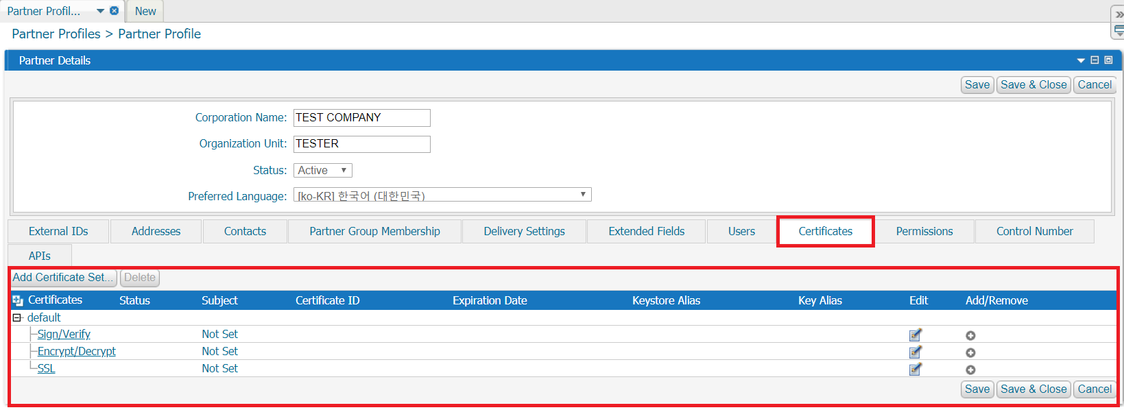 Certificates 탭에서는 인증서가 필요한 경우, 등록하여 관리 할 수 있습니다.