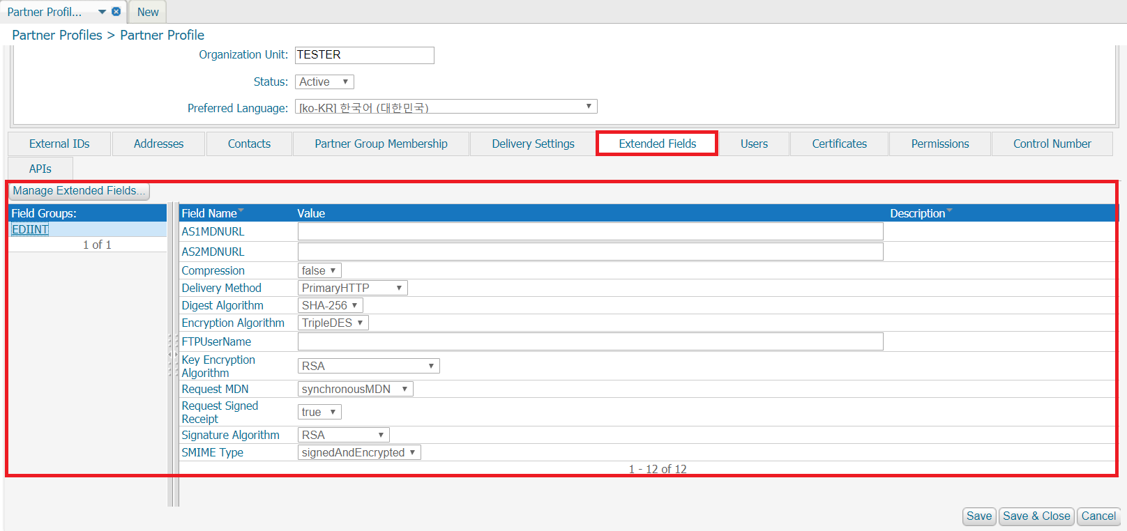 Extended Fields 탭에서는 전송 방법의 확장으로 어떤 알고리즘을 통해 송 수신 할지 그에 따른 성공여부 메시지를 받을지 설정 할 수 있습니다. 일반적으로 TPA(Trading Partner Agreement) 문서 내 기재가 되어 있습니다.