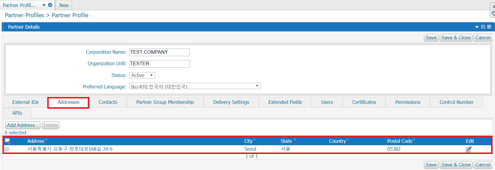 Address 탭에서는 귀사의 정보를 작성할 수 있습니다. Add Address 를 통하여 정보를 등록합니다.