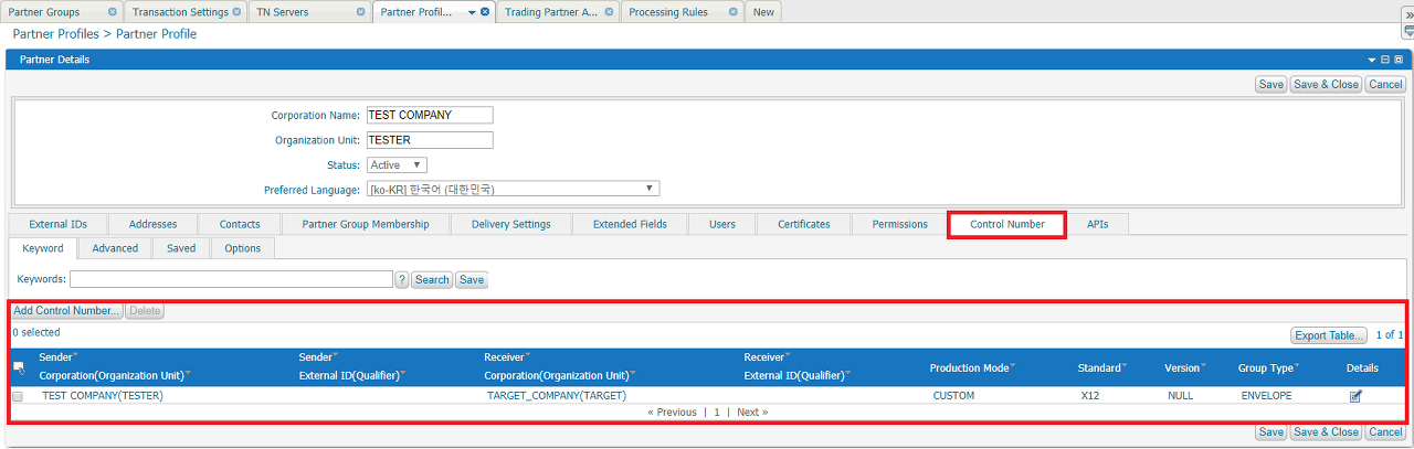 Control Numbers 탭에서는 파트너간의 문서가 교환될때, 중복되거나 순서가 맞는지 검증을 위해서 사용합니다.