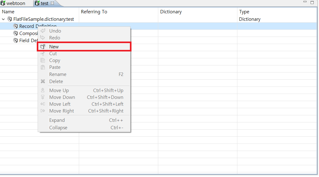 1.Dictionary 생성 후 가장 큰 묶음인 Record Definition 을 시작합니다. 우클릭 -> New를 통해 만들 수 있습니다.