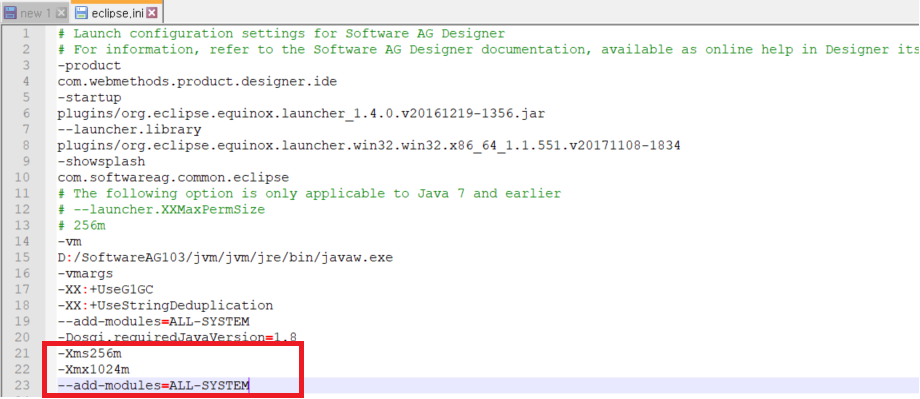 {Software AG_directory}\Designer\eclipse\eclipse.ini 내에서, 2번 그림의 붉은 부분을 변경한다.